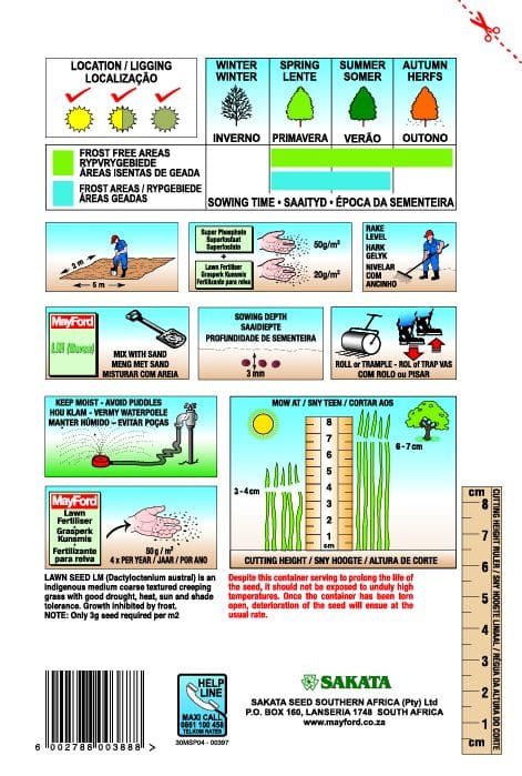 LM (Berea) grass is indigenous to South Africa. It is a creeping grass that thrives in full sun and semi-shaded areas. The grass is fairly broad-leafed and a dark green colour. It is also relatively heat and drought tolerant. Available in 30g packaging.